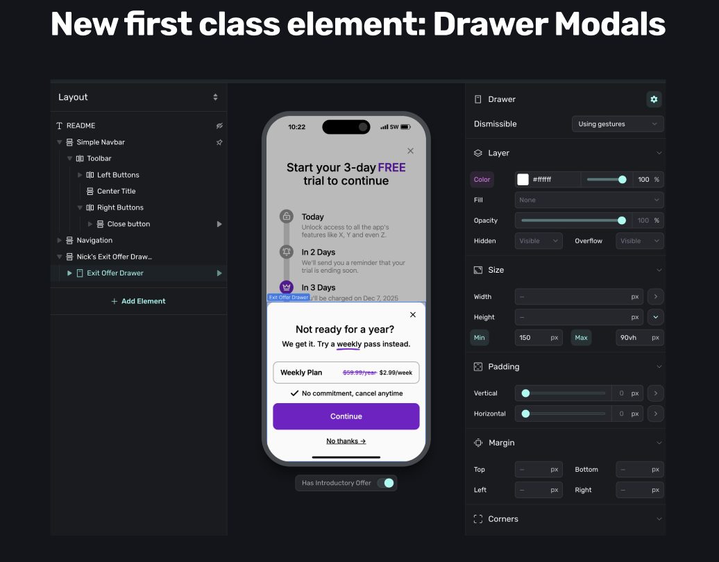 Drawer modals: We shipped a drawer component that feels buttery smooth and native. It's great for things like exit offers, revealing more products, and other similar interactions.