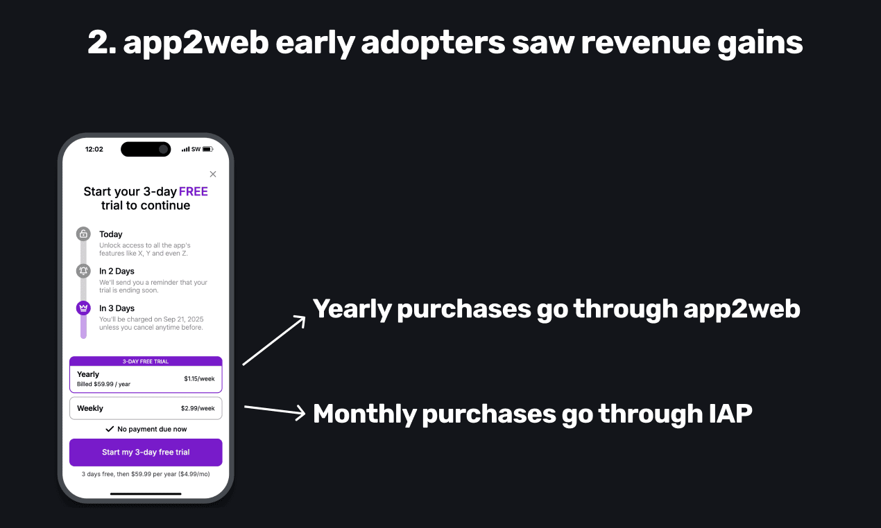 App to Web: Checking out in web increased revenue for some customers, but generally decreased initial conversion rates. Superwall was the first to report on real data here, too.