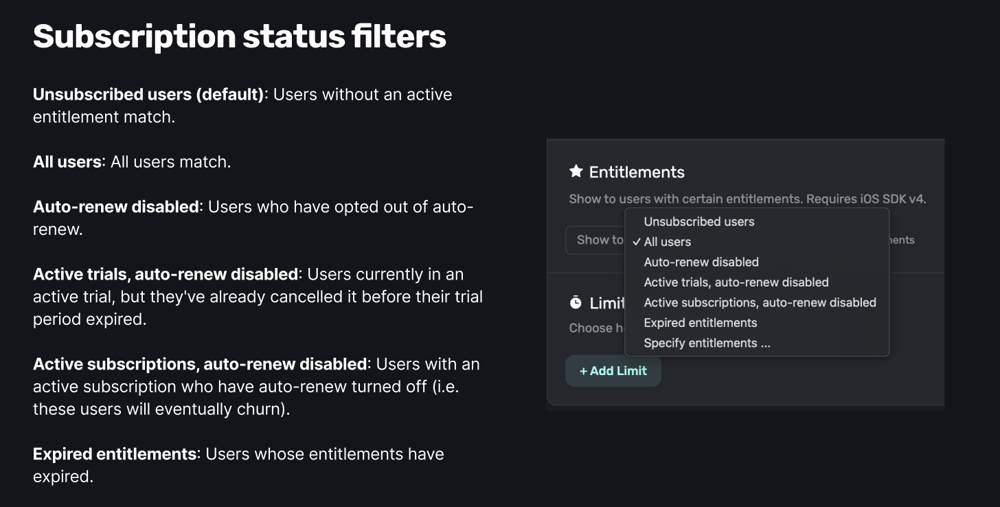 Subscription status filters: This is one of my personal favorites. We made it trivial to target any kind of user. Whether they started a trial and canceled it, have auto-renew disabled, and more.