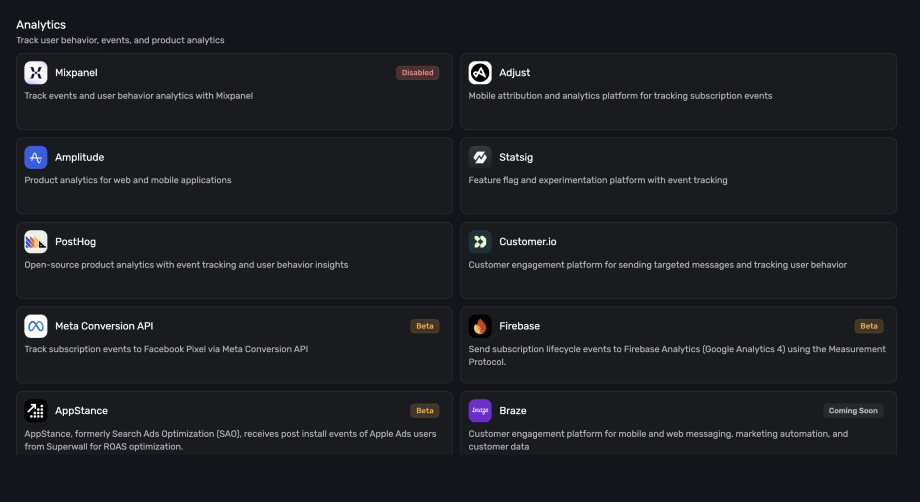 Tons of analytics: At the same time, we've added several analytics integrations such as Mixpanel, Adjust, and several others.