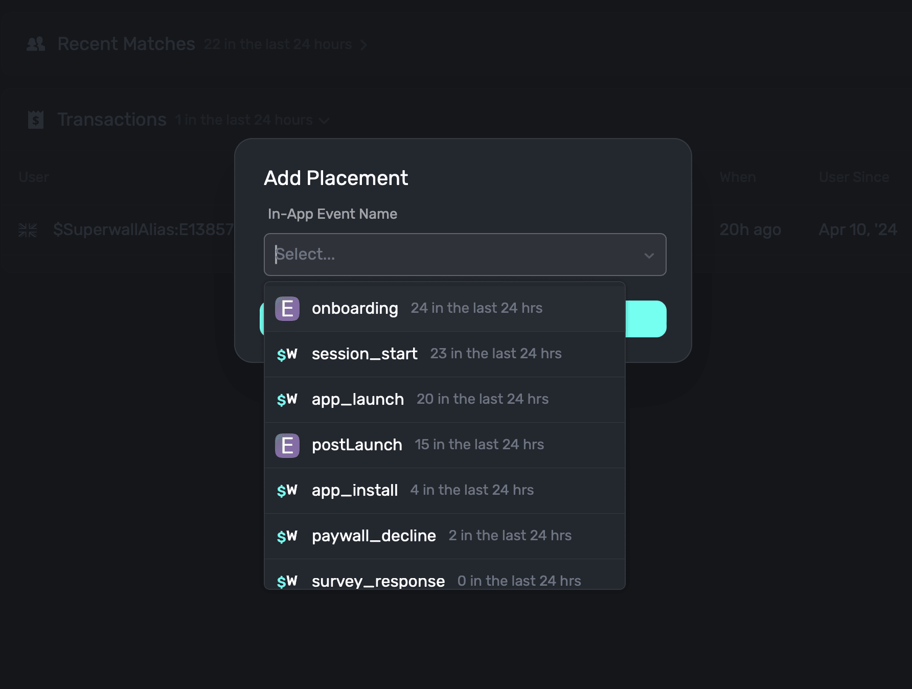 - Use an existing Superwall event: Superwall automatically manages several events that can be used as placements. For example, the