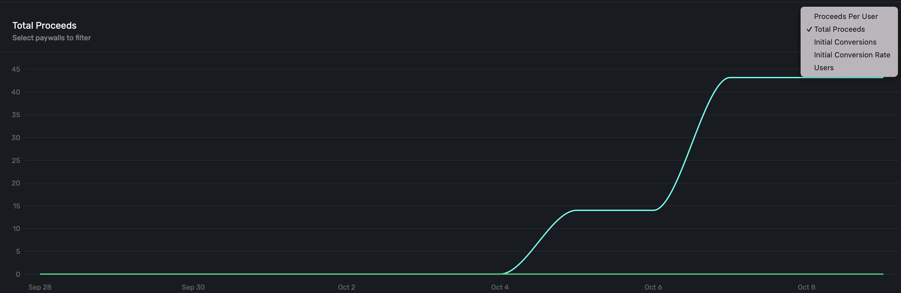 Finally, the last section has several graphs to explore campaign performance. It defaults to Proceeds Per User.