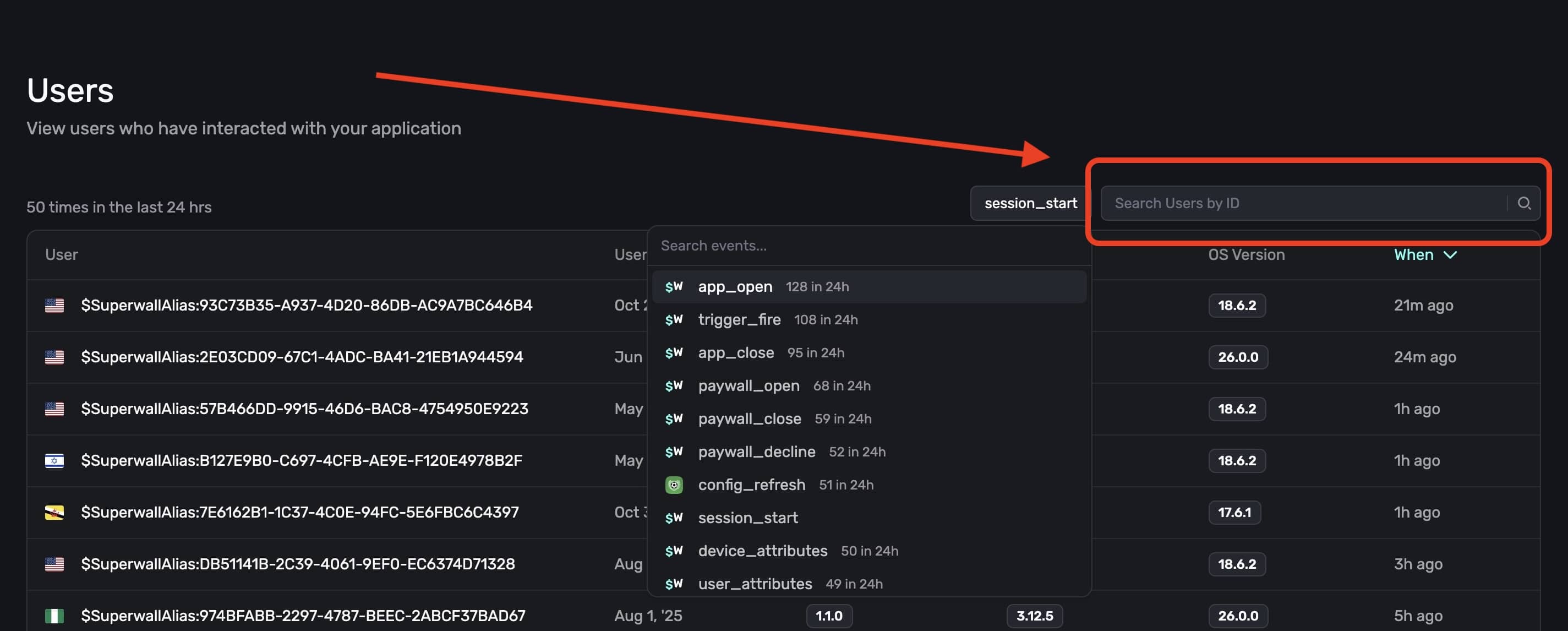 This will find users by their Superwall identifier (i.e. $SuperwallAlias:44409AAF-244D-9F08-A18A-8F66B52FDZ01). Hit Enter once you've copied or typed in an identifier, and the matched user's details will display.