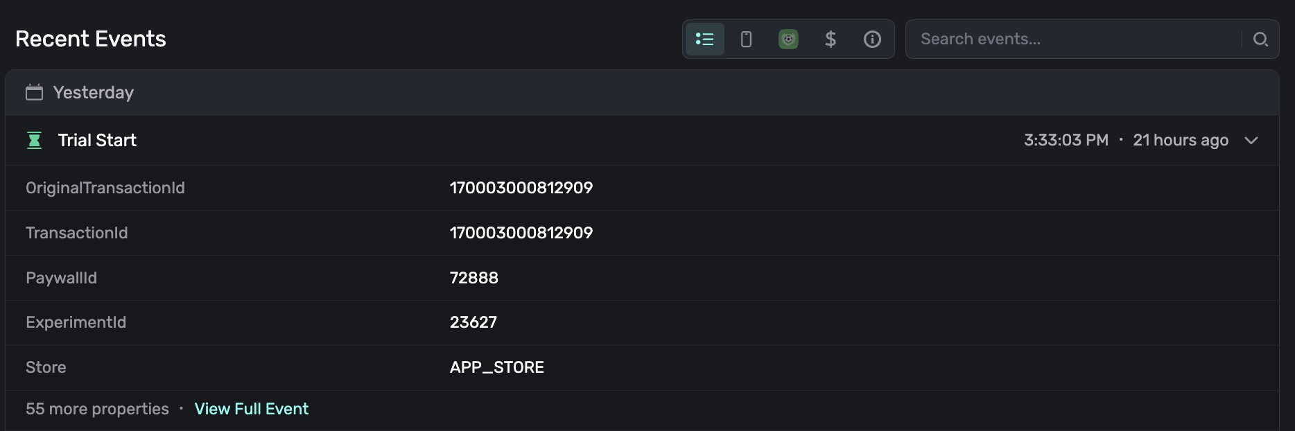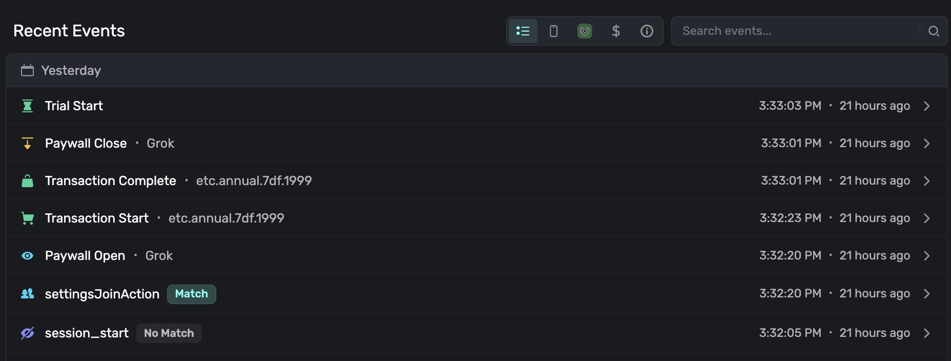 - Recent Events: View revenue events and conversions, SDK events, and see the overall breadcrumb of actions the user has taken. You can filter or search by certain events as well.