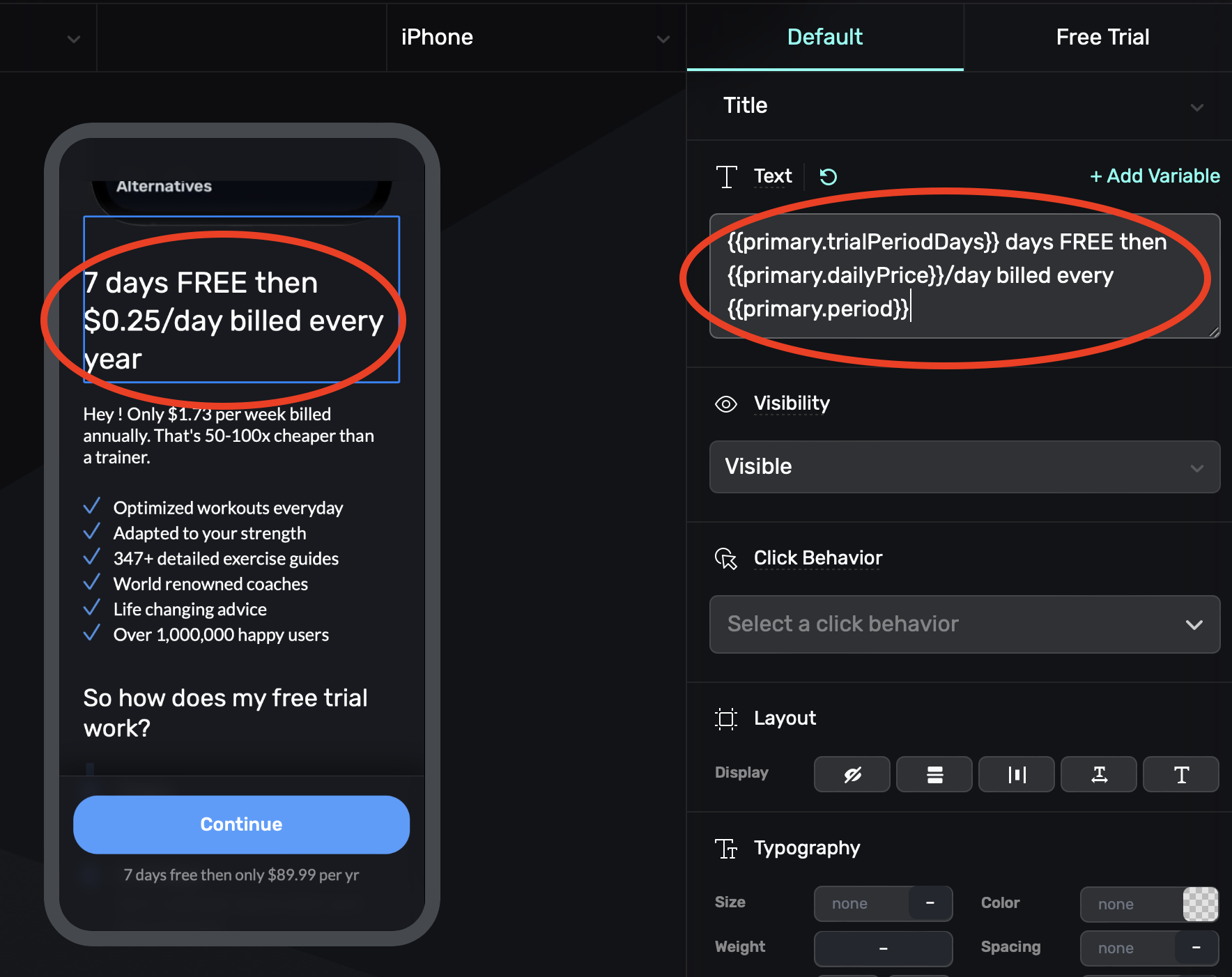 You can click these to toggle between the free trial and default (no free trial) behaviour of the selected element. This also toggles the device preview. When the SDK detects a free trial in any product and the user hasn't already used a free trial within that product's subscription group, it will use the content supplied in the free trial tab. Otherwise it will use the content in the default tab. The free trial tab automatically inherits from the default tab.