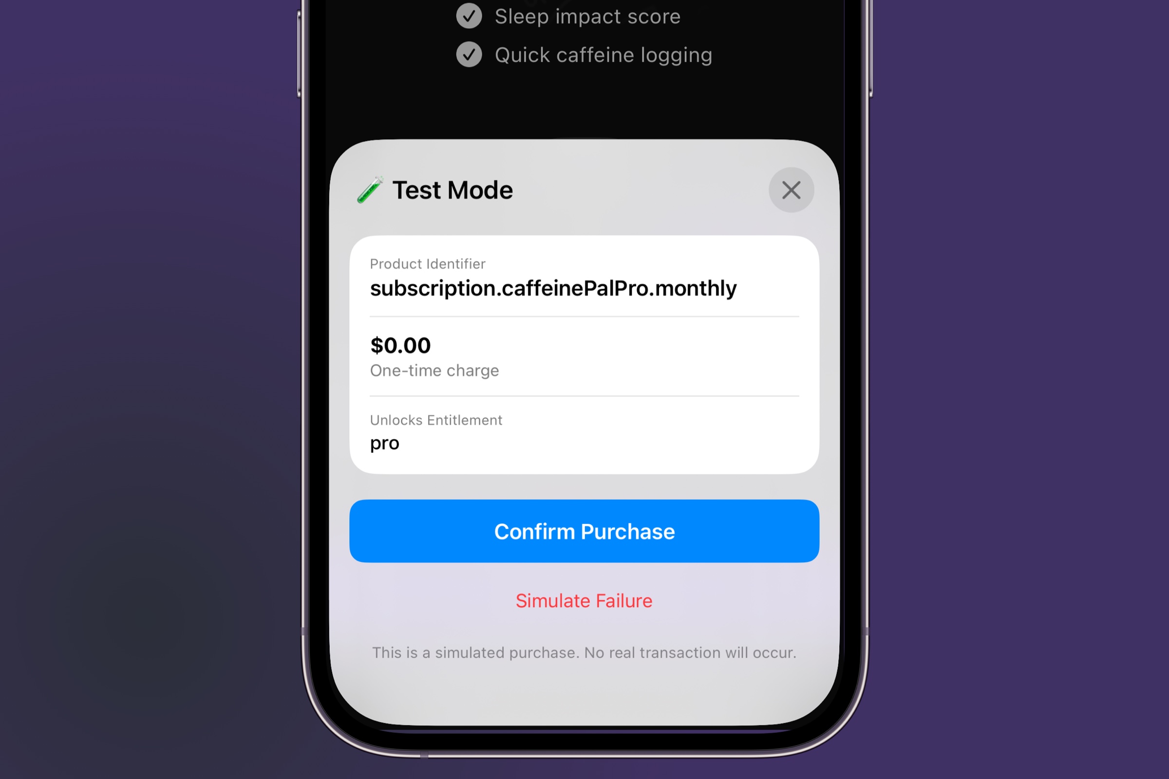 Simulate in-app purchases without StoreKit using test mode, which lets you test your entire paywall flow end-to-end.