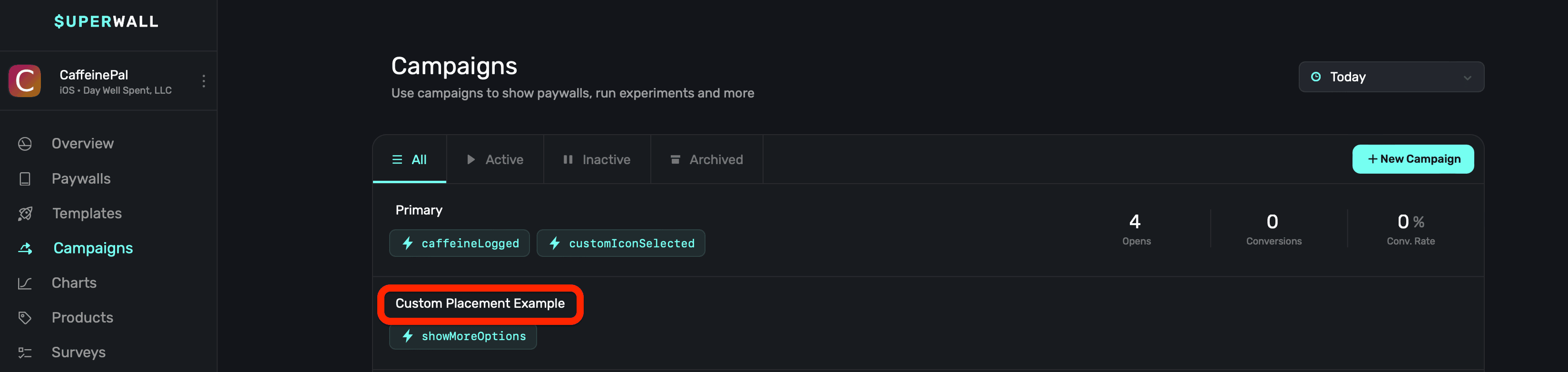 In your new campaign, add a new placement that matches the name of your custom action you added in step one. For us, that's showIconPaywall: