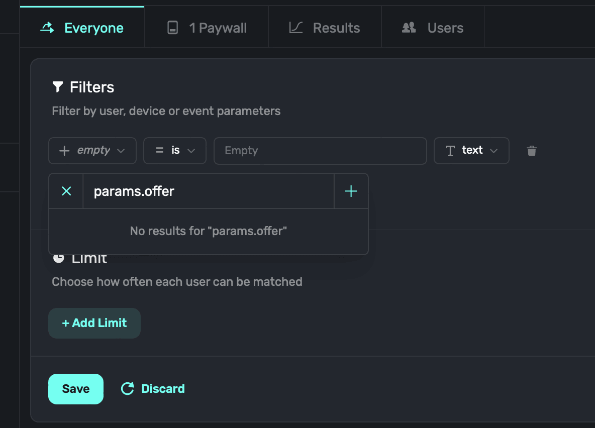 Edit the default audience's filter to match params.[whatever-you-named-the-parameter]. Recall that in our example, the parameter was offer and the value was icons. So here, we'd type params.offer and click the + button: