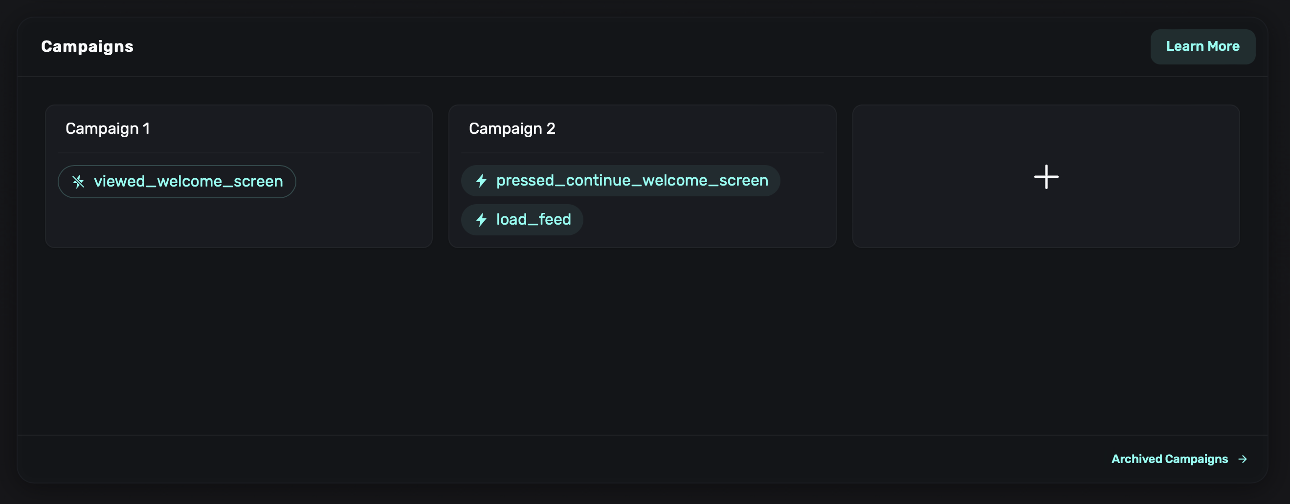 The Campaigns section of the dashboard is where you configure when and who to show a paywall to, using triggers and rules. In the image below, Campaign 2 is triggered when the SDK fires either a pressed_continue_welcome_screen or load_feed event. Campaign 1's trigger is switched off, indicated by a cross through its icon and lack of background color. This means that the campaign won't be triggered for a viewed_welcome_screen event: